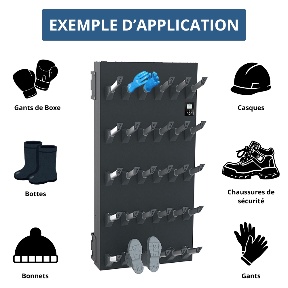 Solution parfaite pour les ouvriers du bâtiments, centres sportifs, conciergerie d’hôtel, ou encore entreprises industrielles ce sèche-chaussures, bottes et gants garantit des équipements toujours secs et prêts à l’emploi. Il est parfait pour sécher des chaussures de sécurité, gant de boxe, bonnet, gant de ski, bottes, casques…