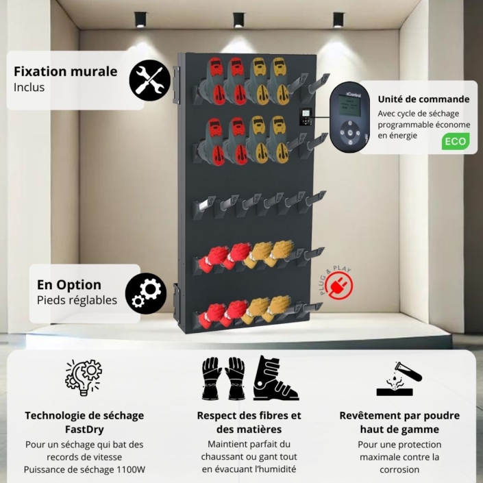 Solution parfaite pour les stations de ski, loueur de ski, conciergerie d’hôtel et les amateurs de sports d’hiver, ce sèche-chaussures de ski / gants garantit des équipements toujours secs et prêts à l’emploi. Il est parfait pour sécher des chaussures de ski, gants, bonnets, casques…
