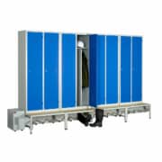 Vestiaire de séchage par ventilation pour 4 à 12 personnes adapté à l’industrie salissante : Tringle porte-cintre / Penderie séparée en deux compartiments / Tablette pouvant recevoir un casque moto / Support de séchage des chaussures sous socle Banc / Vérins de réglage.